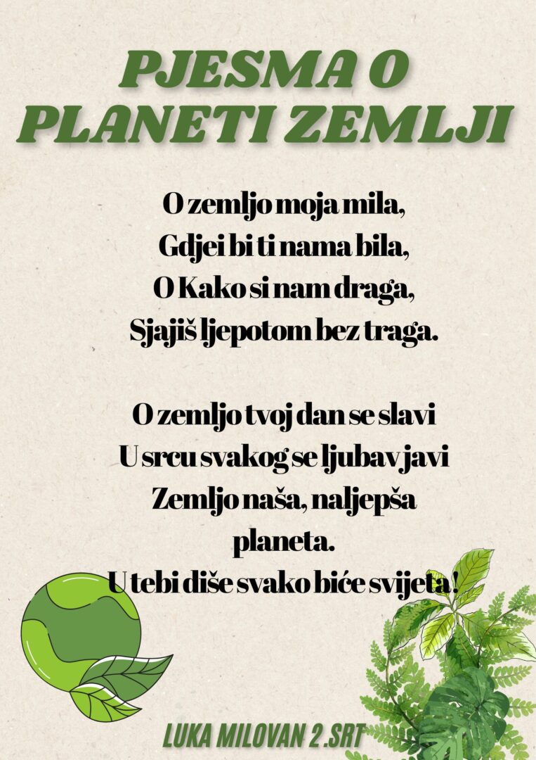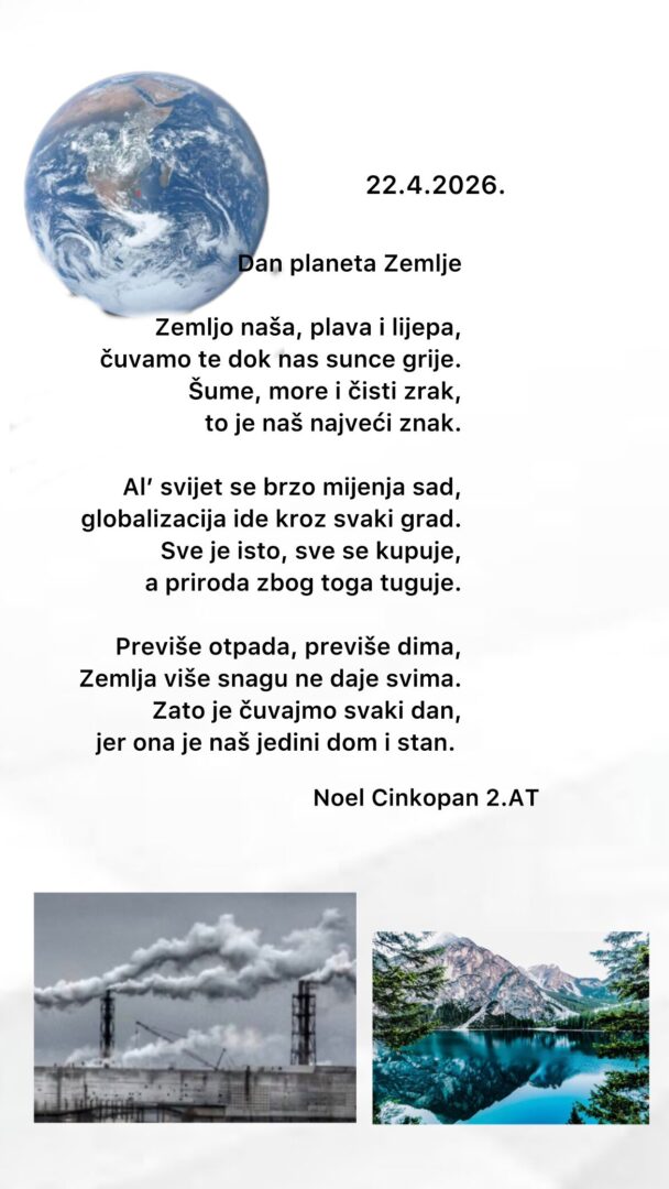 Dana 22. travnja 2026. godine na satovima geografije i povijesti učenici 2. AT i 2. SRT razreda sa prof. Petrom Nemet posvetili su poruke planetu Zemlja. Neke od njihovih uradaka možete pogledati u prilogu. Posebno hvala Luki Milovanu i Maji Katavić iz 2. srt i Noelu Cinkopanu iz 2. at koji su imali veliku inspiraciju u riječima prema svome planetu. Obilježimo dan svojega planeta!